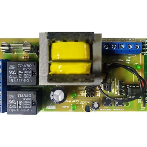 CARACTERÍSTICAS: Bivolt Cadastro de 256 controles ou 512 botões Sistema de códigos Code Learning, Rolling Code, Holp Code e Flex Code Entrada para Botoeira Tecla aprender para cadastramento de controles e aprendizado de percurso (tempo de abertura e fechamento do portão) Memória externa para controles Tecla pausa para aprendizado do tempo de pausa e Fechamento automático do portão Jumper de pausa para habilitar ou desabilitar tempo de pausa Para motores até hp 127/220V Desligamento dos reles nos fins de curso Entrada para fotocélula Saída de acoplador de luz Saída de acoplador de trava Leds indicadores de abertura e fechamento Led PROG para monitoramento de cadastro de controles
