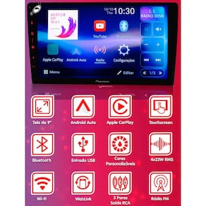 A multimídia Pioneer DMH-AP6650BT possui tela capacitiva de 9" e combina design moderno, conectividade avançada e excelente qualidade sonora. Com a tecnologia "Perfect Fit", oferece instalação versátil em diferentes molduras de painel e possui chassi compacto. Sua tela trapezoidal de alta resolução proporciona uma experiência visual imersiva. Compatível com Apple CarPlay, Android Auto, WebLink e WebLink Cast, a unidade também integra funções orig.inais do veículo via CAN Bus. A qualidade de áudio é aprimorada pelo processador DSP 24-Bit e equalizador de 13 bandas. Ideal para quem busca modernizar o carro sem perder a ori.ginalidade, inclui ainda integração com câmeras de ré.