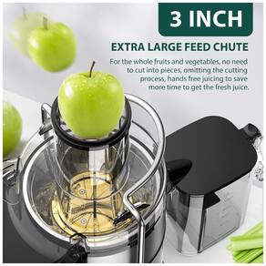 Centrífuga de frutas com motor de 1200W, 3 velocidades, calha de alimentação extra grande, lâminas de aço inoxidável e design prateado.Nº de velocidades