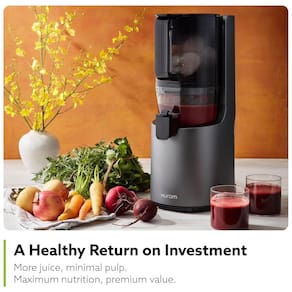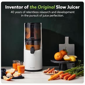 Centrífuga de frutas automática HUROM H200 com design ergonômico, tremonha de alimentação automática, sistema de limpeza fácil e tamanho compacto.Nº de velocidades