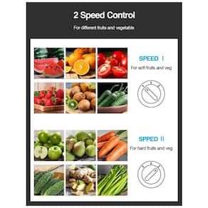 Centrífuga de frutas com motor de 500W, 2 velocidades, boca larga, sistema de segurança com travamento e proteção contra sobrecarga. Fácil de limpar com peças destacáveis.Nº de velocidades