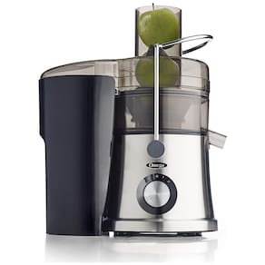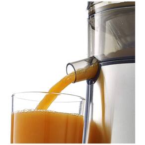 Centrífuga de frutas com calha extra grande, 2 velocidades e recipiente de polpa removível. Possui mecanismo de travamento de segurança e ventosas antiderrapantes.