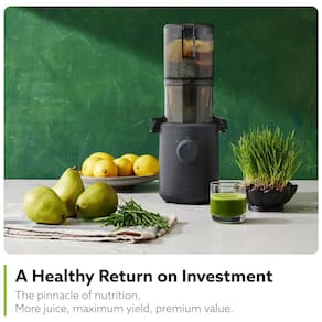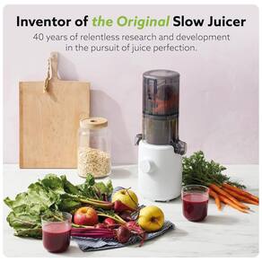 Centrífuga de frutas de mastigação lenta Hurom com motor silencioso de 150W, design elegante e fácil de limpar. Preserva nutrientes e sabor natural.Nº de velocidades