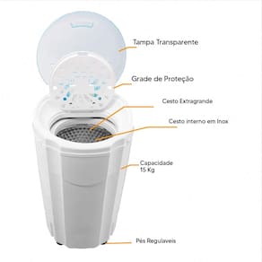 Centrífuga de Roupas Britânia BCR15B com capacidade de 15kg, cesto extragrande em aço inox, timer, sistema de segurança e alta eficiência na secagem.Timer