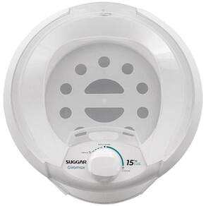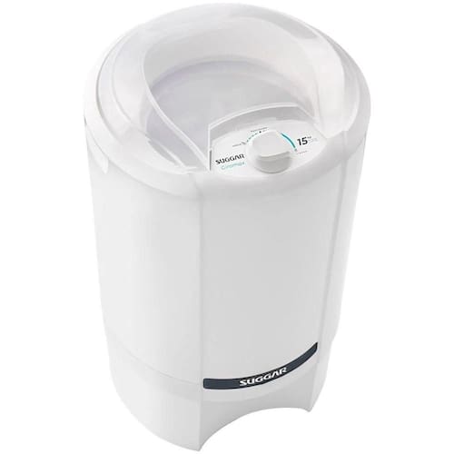 Centrifuga de Roupas Suggar Giromax, possui capacidade de 15kg para roupas molhadas ou 5kg de roupas secas, timer de 7 min. c/ desligamento automatico, saida de agua frontal, grade de protecao para fechamento do cesto, sistema de trava de seguranca patenteado (impede a abertura da tampa durante o funcionamento), porta fio integrado na base.