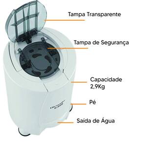 Além disso, o modelo conta com trava de segurança automática, que impede a abertura da tampa enquanto o cesto estiver em movimento.