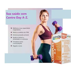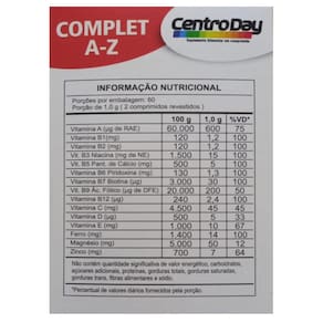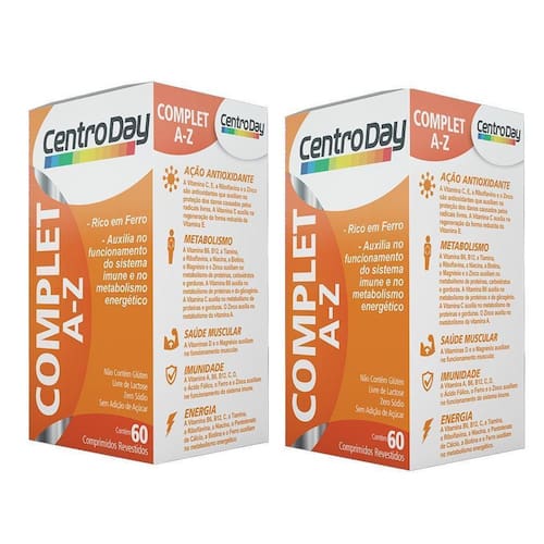 Marca: Centro Day Complet A-Z Tipo de cápsula: Comprimidos revestidos Quantidade de cápsula: 60 comprimidos Miligramas por cápsula: 500mg Ingredientes: 15 vitaminas e minerais Tipo de Produto: Multivitamínico Registro: RDC ANVISA 429 DE 2010 Não contém: Glúten, Lactose, gordura trans, Sódio, Soja, Derivados. Origem: Nacional Modalidade da Venda: Kit Composição do Kit: 2 unidades com 60 cápsulas cada Total de Cápsulas no kit: 120 Segurança: Lacrado direto do laboratório lacre interno e externo Modo de tomar: 1 comprimido ao dia Ean: 7898442105864