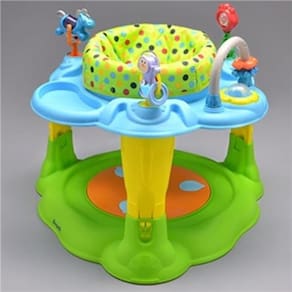 Para crianças entre 6 e 18 meses Assento giratório em 360º, possibilitando que a criança gire o corpo e alcance todos os brinquedos. Brinquedos diversos localizados na base superior, com luzes, sons e movimentos divertidos. Assento totalmente acolchoado, em tecido macio e de fácil limpeza. Bandeja musical (alimentada por pilhas), contendo musicas variadas. Plataforma removível que transforma-o em mesa ou pula-pula. Altura regulável em três posições.
