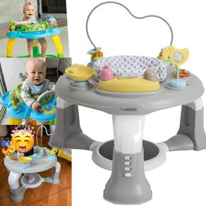 O Groovy é indicado para crianças a partir de 4 meses, com peso máximo de 12 kg ou até 76,5 cm de altura. Seu assento giratório permite que o bebê alcance todos os brinquedos, favorecendo o estímulo sensorial e o fortalecimento dos músculos. A bandeja conta com arco de brinquedos e mais cinco opções de interação, sendo uma delas musical.