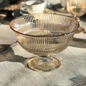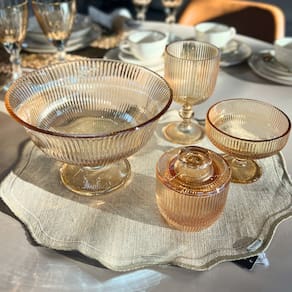 Elegância Duradoura: O relevo listrado e a cor âmbar vibrante criam um visual sofisticado, harmonizando com diversos estilos de mesa ou cristaleira.