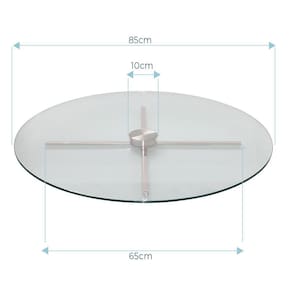 Altura: 5cm Diâmetro: 85cm Diâmetro base: 65cm Base de inox: 10cm Espessura do vidro: 10mm Cor: incolor Material: vidro temperado Base giratória inox 304