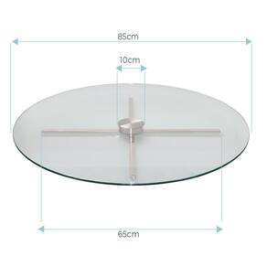 Altura: 5cm Diâmetro: 85cm Diâmetro base: 65cm Base de inox: 10cm Espessura do vidro: 10mm Cor: incolor Material: vidro temperado Base giratória inox 304