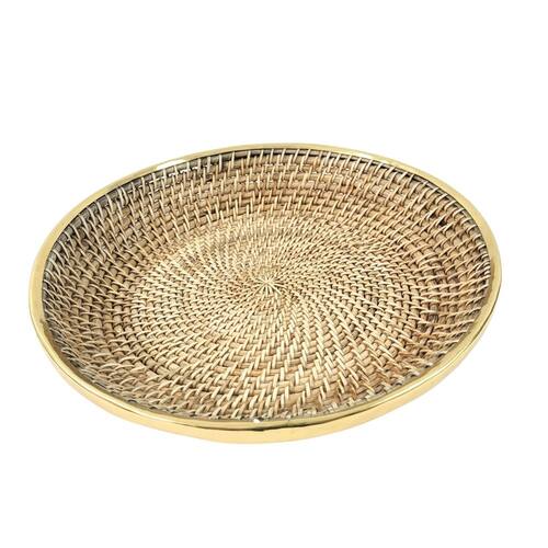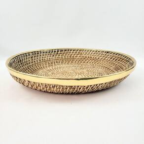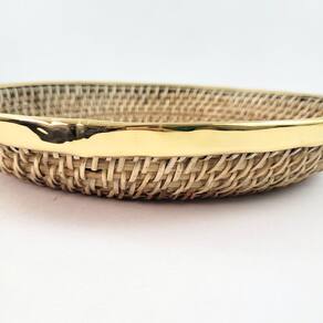 Centro De Mesa Junco Redondo Com Borda Dourada 40cm Centro de Mesa Redondo em Fibra Natural com Borda Dourada - 40cm Com design sofisticado e acabamento natural, este centro de mesa redondo é a escolha perfeita para quem busca unir charme e funcionalidade na decoração. Produzido em junco fibra natural com borda metálica dourada, ele é ideal para salas de jantar, mesas de centro, aparadores e ambientes com estilo moderno ou rústico chic. Características do Produto: Material da base: Fibra natural junco Borda metálica com acabamento dourado Formato: Redondo Altura: 8 cm Diâmetro: 40 cm Peso aproximado: 565g Diferenciais: Combina com vários estilos de decoração Estrutura firme e acabamento artesanal Ideal para compor mesas com vasos, velas, frutas ou arranjos Também pode ser Utilizado como bandeja decorativa Cuidados: Limpar com pano seco ou levemente umedecido Não utilizar produtos abrasivos Evitar exposição prolongada ao sol e à umidade para preservar a cor natural da fibra Observação: Os objetos decorativos das imagens não acompanham o produto.