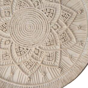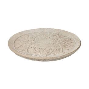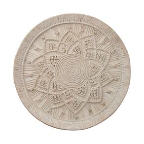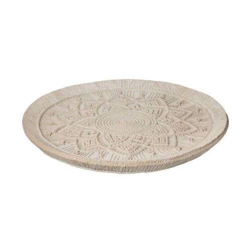 O Centro de Mesa Tiki tem 25 cm e é produzido em resina, com acabamento rústico e detalhes geométricos em baixo relevo destacando a mandala no centro.