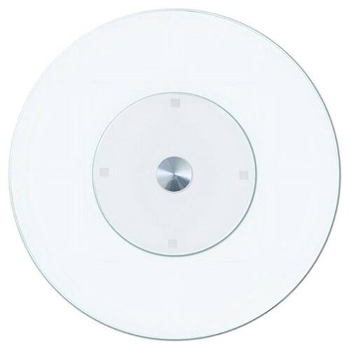 Diâmetro do prato: 60cm Diâmetro da base: 30cm Espessura vidro: 8mm Material: Vidro temperado incolor / aço inox