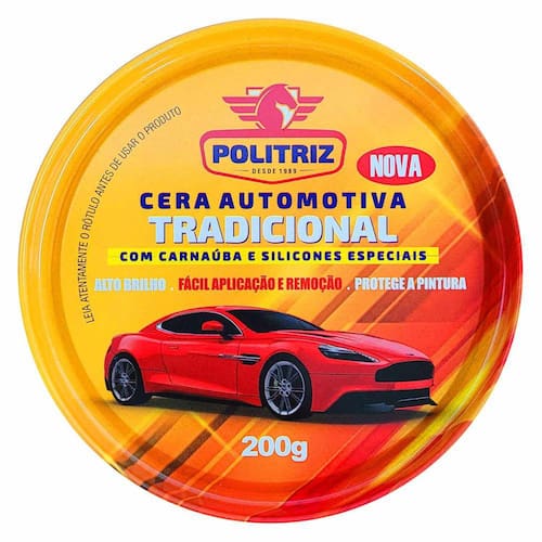 A Cera Automotiva Tradicional Politriz proporciona brilho intenso e de longa duração. De fácil aplicação e remoção, sua fórmula protege a pintura das ações nocivas do sol, da chuva e do tempo. Contém Carnaúba e silicones especiais.Se você toma cuidado para não passar em buracos na pista, abastece com combustível de qualidade e lava seu carro com frequência, você cuida bem do seu veículo. Mas se você usa Cera Automotiva Politriz, esse cuidado já evoluiu para amor. A Cera Automotiva Politriz Tradicional tem fácil aplicação e remoção, deixa seu carro brilhando ao mesmo tempo em que protege a pintura. Conheça!