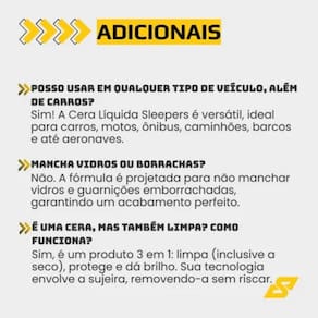 - "Posso usar em qualquer tipo de veículo, além de carros?" Sim! A Cera Líquida Sleepers é versátil, ideal para carros, motos, ônibus, caminhões, barcos e até aeronaves.