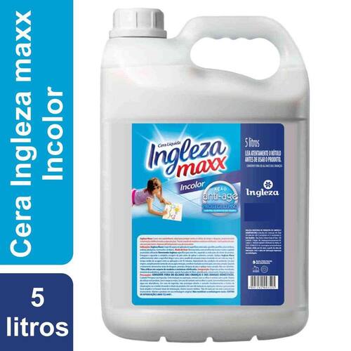 Cera liquida ingleza maxx 5lt incolor Cera liquida ingleza maxx maxx incolor 5 litrosIndicação de uso: Indicada para todos os tipos de pisos porosos e laváveis como, granilite, mármore, marmorite, paviflex, manta vinílica, ardósia, plurigoma, exceto em cerâmicas e porcelanatos vitrificados, carpetes de madeira, granitos e mármores polidosModo de usar: Aplique de 2 a 3 camadas de ingleza maxx uniformemente sobre a superfície limpa e seca. O brilho é instantâneo: secou, brilhou o tempo médio de secagem entre as camadas é de 45 minutos, dependendo das condições do ambiente.