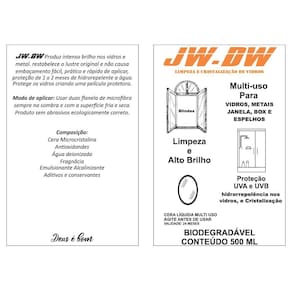 limpeza a seco, cristalização, brilho e proteção que repele a sujeira de vidros e metais. Acabamento impecável para box de banheiros, janelas, metais e muitas outras superfícies protege a pintura criando uma película protetora com duração média de 1 até 2 meses de ação hidrorrepelente. Benefícios: - zero de água para lavar o seu carro - sustentável, não agride o meio ambiente - pode ser utilizado para limpar fogão, geladeira com menos esforço - pode ser utilizado em plásticos, vidros e metais em geral. - dá brilho em metais. Modo de aplicar: usar duas flanelas de microfibra, uma para aplicar o produto e tirar a sujeira e outra sem o produto para finalizar o brilho e proteção. Utilizar o produto sempre na sombra e com a pintura fria. Produto biodegradável sem abrasivos e ecologicamente correto. Composição: cera microcristalina, cristalizador de vidro, antioxidantes, água deionizada, fragrância, emulsionante alcalinizante, aditivos e conservantes. Marca: Jw-Dw