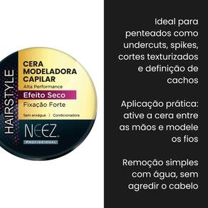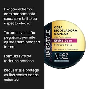Cera Modeladora Capilar Efeito Seco Neez 60g – Estilo com Controle e Naturalidade! A Cera Modeladora Neez com efeito seco é perfeita para quem busca definição, fixação e acabamento natural sem deixar resíduos ou brilho excessivo. Ideal para modelar, texturizar e controlar os fios com praticidade e durabilidade. Benefícios: Efeito seco: visual natural e sem brilho Alta fixação sem deixar o cabelo pesado Textura leve e fácil de aplicar Ideal para todos os tipos de cabelo Não deixa resíduos e é fácil de remover Indicado para: Modelar penteados, controlar fios rebeldes e criar estilos modernos com acabamento discreto