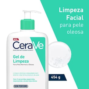 CeraVe Gel de Limpeza Facial 454g para peles normais a oleosas. Contém 3 ceramidas essenciais e não possui perfume. Esse e outros você encontra na Drogaria Araujo. Confira!