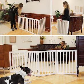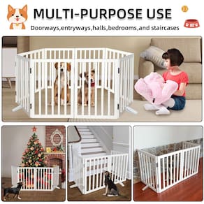 O SFJC Dog Gate é uma opção versátil para proteger e impedir que seu novo filhote ou gatinho explore muito a casa. Este portão para animais de estimação possui um design articulado semelhante a um acordeão que permite dobrá-lo para caber em quase qualquer porta ou corredor. A peça é feita de madeira resistente com dobradiças de metal duráveis. As ripas largas fornecem uma barreira segura sem que seu animal de estimação se sinta completamente isolado da família. CARACTERÍSTICAS: 1?Expandido para acomodar quase qualquer largura 2?Chega totalmente montado 3?Design dobrável e independente 4?Adequado para cães de todos os tamanhos e raças 5?A porta para cães é feita de madeira natural 6?Pés de plástico resistentes e antiderrapantes que mantêm seus pisos protegidos contra arranhões 7?Visual elegante e elegante com qualquer variedade de estilos de decoração - ?Material de portão dobrável de madeira?O portão interno para cães é feito de madeira 100% natural, a madeira natural é conhecida por sua resistência e durabilidade, beleza natural, selada com tinta especial para manter o desgaste e resistente à corrosão. Os pés de plástico antiderrapantes da cerca para cães protegem seu chão - ?Design dobrável e expansível? O portão dobrável para cães SFJC é independente e pode ser dobrado em forma de Z amplo que permite que você o use em portas internas, portões duplos ou portas padrão, quartos, escadas ou qualquer lugar da sua casa - ?3 painéis? A cerca para cães é construída com 3 painéis separados, presos junto com dobradiças resistentes de aço inoxidável - ?Não é necessário montar? Os portões para cães já vêm completamente montados, basta desdobrar o portão do animal de estimação e usar o portão para filhotes na área que você precisa. Este portão para cães é uma excelente maneira de restringir o acesso do seu cão a partes da sua casa, mantendo um visual moderno - ?Tamanho?: Tamanho aberto: L 152 cm * P 0,190 cm (A) 81 cm; Tamanho dobrado: L 50 cm * P 6 cm x A 81 cm
