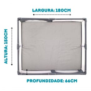 Especificações técnicasCaracterística150?cm x 180 cm x 68 cm Dimensões externas (CxLxA)150??150??68?cm Peso aproximado2?kg Material da estruturaAço carbono com pintura epóxi MalhaOxford resistente e lavável CapacidadeAté 15?kg Conteúdo da embalagem