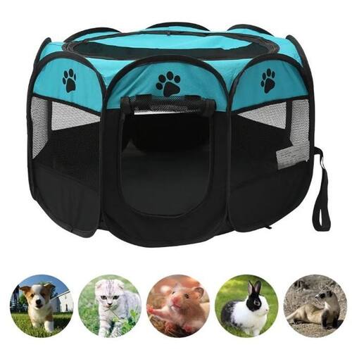 Cercadinho Para Cachorros Gatos Dobrável Portátil Grande Cor: Azul Este cercadinho para pets, como cão, gato, coelho e hamster, é uma solução prática e conveniente para criar um espaço seguro e delimitado onde seu animal de estimação possa brincar, descansar e se sentir protegido. Por ser dobrável e de fácil montagem, este cercadinho é especialmente útil em situações em que você precisa conter seu pet temporariamente, como em viagens, acampamentos, visitas a amigos ou familiares, ou mesmo em casa para criar uma área controlada.