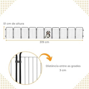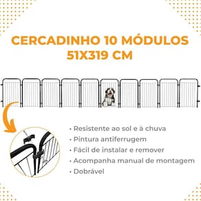 Cercado Caes Pet Cachorro Grade Cerca 10 Módulos 51cm Altura Cor: Preto Bem vindo à UTILITY Somos uma loja online especializada em utilidades PET, utilidades Domésticas e produtos Pegue e Faça você mesmo Entrega rápida, qualidade garantida e compra 100% segura Descrição do Produto: - 01 Cercadinho Dobrável Benefícios: - Pode ser fixado com parafusos - Leve e fácil de montar - Fácil de guardar por ser dobrável - Ótimo custo-benefício - Restringe espaços para maioria dos pets de pequeno e médio portes - Alta durabilidade por ser feito em aço e ter tratamento antiferrugem Indicado para: - Pets de pequeno e médio porte que não tendem a empurrar ou saltar o cercado. - Apartamentos e casas - Portas, vãos pequenos e corredores Especificações: - Material: Aço Carbono - Cor: Branco ou Preto Aberto: - Altura: 51 cm - Largura máxima: 319 cm - Profundidade: 2 cm Fechado: - Altura 56 cm - Largura 34 cm - Profundidade 11 cm Medida do módulo: - Altura: 51 cm - Comprimento: 31 cm Espessura do aramado e tubo: - Tubo 1,6 cm - Aramado 3 mm Espaço entre as grades: - 4 cm Espaço entre aramado e tuto Parte superior do módulo : - 6,5cm Espaço entre aramado e solo Parte inferior : - 2,5cm Outros conjuntos disponíveis com 50 cm de altura: - Módulo avulso, possui 31 cm - Conjunto 3 módulos, possui 95 cm - Conjunto 4 módulos, possui 1,27 metros - Conjunto 5 módulos, possui 1,59 metros - Conjunto 6 módulos, possui 1,91 metros - Conjunto 7 módulos, possui 2,23 metros - Conjunto 8 módulos, possui 2,55 metros - Conjunto 9 módulos, possui 2,87 metros - Conjunto 10 módulos, possui 3,19 metros É possível encontrá-los visitando nossa página Ao pesquisar por Cercados, será apresentado todos os modelos disponíveis em nosso catálogo. Utilize os filtros para encontrar a quantidade de módulos desejada. : 6 meses por defeito de fabricação. Entrega: Assim que recebemos seu pedido, fazemos a postagem em até 24h. Aguardamos seu retorno Obrigado Equipe Utility Cod: FB02Cerc50