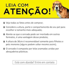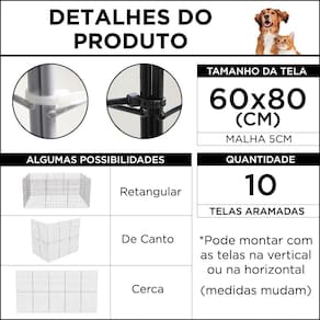CERCADO CACHORRO ARTICULADO MÓVEL PET 10 TELAS ARAMADAS 60x80 ROSE * 10 TELAS, VÁRIAS POSSIBILIDADESEste tipo de cercado é montado com telas aramadas e abraçadeiras de nylon, o que o torna um produto versátil para ser montado conforme a sua necessidade, além da possibilidade de simplesmente guardá-lo montado de uma forma que ocupe menos espaço.Serve para animais de pequeno e médio porte ou filhotes como de cachorro e gato. Também é apropriado para coelho, porquinho da índia entre outros pets, com a devida atenção se atravessam ou não a malha da grade.Existe a possibilidade de usar as telas como cerca e portão com as devidas precauções e adaptações por conta do cliente.RECOMENDAÇÕES DE USO:- Filhotes de cachorros e gatos;- Cachorros de pequeno e médio porte;- Porquinhos da Índia, mini coelhos e coelhos.* Recomendamos que sempre verifique antes da escolha se o seu PET não atravessa a malha das telas (buracos) e/ou se ele não salta pelo cercado.DIMENSÕES APROXIMADAS/ POSSIBILIDADES: - Cercado Retangular 1ª Opção: 180x120X80cm - Cercado Retangular 2ª Opção: 240x160x60cm - Cerca Linha Reta 1ª Opção: 80x600cm (6 metros) - Cerca Linha Reta 2ª Opção: 60x800cm (8 metros)CARACTERÍSTICAS: - Cor: Rose - Acabamento em pintura eletrostática - Material Tela: Aço - Material Abraçadeira: Nylon - Telas: 60x80cm - Malha: 5cmRECOMENDAÇÃO - Clips auto adesivos servem para ajudar na imobilização do cercado e dispensam furação; - Parafuso gancho ajuda a imobilizar de forma mais firme, pois precisam furar a parede ou chão para colocá-los; - Conectivos ajudam na montagem de um cercado fixo (conectivos são removíveis quando precisar)* Possuímos os mais variados tipos de cercados em modelos e tamanhosITENS INCLUSOS:- 10 telas 60x80cm e abraçadeiras de nylon para montagem de um cercado móvel* Procurou um modelo e não encontrou? Tem algum projeto específico? Não sabe como aumentar seu cercado? Deixe-nos saber e vamos te ajudar!OBSERVAÇÕES: - Garantia de 3 meses contra defeitos de fabricação - O produto vai desmontado para ser montado no local - Imagens ilustrativas e com sugestões de montagem - Não nos responsabilizamos pelo uso inadequado do produtoNão deixe de conhecer nossos outros produtos! Marca: IGUANNA