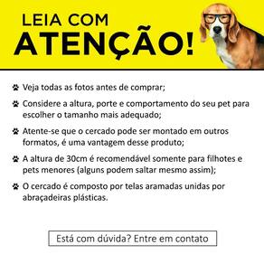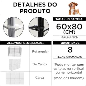 CERCADO CACHORRO ARTICULADO MÓVEL PET 8 TELAS ARAMADAS 60x80 PRETO * 8 TELAS, VÁRIAS POSSIBILIDADESEste tipo de cercado é montado com telas aramadas e abraçadeiras de nylon, o que o torna um produto versátil para ser montado conforme a sua necessidade, além da possibilidade de simplesmente guardá-lo montado de uma forma que ocupe menos espaço.Serve para animais de pequeno e médio porte ou filhotes como de cachorro e gato. Também é apropriado para coelho, porquinho da índia entre outros pets, com a devida atenção se atravessam ou não a malha da grade.Existe a possibilidade de usar as telas como cerca e portão com as devidas precauções e adaptações por conta do cliente.RECOMENDAÇÕES DE USO:- Filhotes de cachorros e gatos;- Cachorros de pequeno e médio porte;- Porquinhos da Índia, mini coelhos e coelhos.* Recomendamos que sempre verifique antes da escolha se o seu PET não atravessa a malha das telas (buracos) e/ou se ele não salta pelo cercado.DIMENSÕES APROXIMADAS/ POSSIBILIDADES: - Cercado Quadrado 1ª Opção: 120x120X80cm - Cercado Quadrado 2ª Opção: 160x160X60cm - Cercado Retangular 1ª Opção: 180x60x80cm - Cercado Retangular 2ª Opção: 240x80x60cm - Cerca Linha Reta 1ª Opção: 80x480cm (4,8 metros) - Cerca Linha Reta 2ª Opção: 60x640cm (6,4 metros)CARACTERÍSTICAS: - Cor: Preto - Acabamento em pintura eletrostática - Material Tela: Aço - Material Abraçadeira: Nylon - Telas: 60x80cm - Malha: 5cmRECOMENDAÇÃO - Clips auto adesivos servem para ajudar na imobilização do cercado e dispensam furação; - Parafuso gancho ajuda a imobilizar de forma mais firme, pois precisam furar a parede ou chão para colocá-los; - Conectivos ajudam na montagem de um cercado fixo (conectivos são removíveis quando precisar)* Possuímos os mais variados tipos de cercados em modelos e tamanhosITENS INCLUSOS:- 8 telas 60x80cm e abraçadeiras de nylon para montagem de um cercado móvel* Procurou um modelo e não encontrou? Tem algum projeto específico? Não sabe como aumentar seu cercado? Deixe-nos saber e vamos te ajudar!OBSERVAÇÕES: - Garantia de 3 meses contra defeitos de fabricação - O produto vai desmontado para ser montado no local - Imagens ilustrativas e com sugestões de montagem - Não nos responsabilizamos pelo uso inadequado do produtoNão deixe de conhecer nossos outros produtos! Marca: IGUANNA