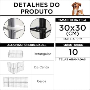 CERCADINHO MÓVEL PARA CACHORRO GATO PEQUENO PORTE PORQUINHO DA ÍNDIA COM TELA ARAMADA 30CM DE ALTURA* 10 TELAS, VÁRIAS POSSIBILIDADESEste tipo de cercado é montado com telas aramadas e abraçadeiras de nylon, o que o torna um produto versátil para ser montado conforme a sua necessidade, além da possibilidade de simplesmente guardá-lo montado de uma forma que ocupe menos espaço.Serve para animais de pequeno porte ou filhotes como de cachorro e gato. Também é apropriado para porquinho da índia entre outros pets, com a devida atenção se atravessam ou não a malha da grade.Existe a possibilidade de usar as telas aramadas como cerca e portão com as devidas precauções e adaptações por conta do cliente.RECOMENDAÇÕES DE USO:- Filhotes de cachorros e gatos;- Cachorros de pequeno porte;- Porquinhos da Índia.* Recomendamos que sempre verifique antes da escolha se o seu PET não atravessa a malha das telas (buracos) e/ou se ele não salta pelo cercado.DIMENSÕES APROXIMADAS/ POSSIBILIDADES: - Cercado Retangular 1ª Opção: 30x120cm - Cercado Retangular 2ª Opção: 60x90 cm - Cercado Decágono: 30cm cada lado - Cerca Linha Reta: 300cm (3 metros) - Cerca Larga: 60x150cmCARACTERÍSTICAS: - Cor: Preto - Material Tela: Aço - Acabamento em Pintura Eletrostática - Material Abraçadeira: Nylon - Telas: 30x30cm - Malha: 5cmRECOMENDAÇÃO - Clips auto adesivos servem para ajudar na imobilização do cercado e dispensam furação; - Parafuso gancho ajuda a imobilizar de forma mais firme, pois precisam furar a parede/ou chão para colocá-los; - Conectivos ajudam na montagem de um cercado fixo (conectivos são removíveis quando precisar)* Possuímos os mais variados tipos de cercados em modelos e tamanhosITENS INCLUSOS:- 10 telas 30x30cm e abraçadeiras de nylon para montagem de um cercado móvel* Procurou um modelo e não encontrou? Tem algum projeto específico? Não sabe como aumentar seu cercado? Deixe-nos saber e vamos te ajudar!OBSERVAÇÕES: - Garantia de 3 meses contra defeitos de fabricação - O produto vai desmontado para ser montado no local - Imagens ilustrativas e com sugestões de montagem - Não nos responsabilizamos pelo uso inadequado do produtoNão deixe de conhecer nossos outros produtos! Marca: IGUANNA