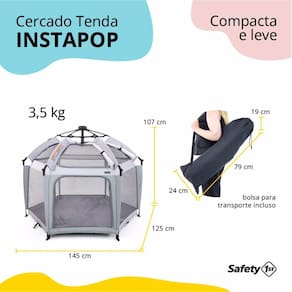 Como especialistas em segurança, nós da Safety 1st sabemos que manter as crianças entretidas e protegidas é o desejo de mães ou pais também nos momentos de lazer e brincadeiras. Divertido e prático, o Cercado Tenda Instapop da Safety 1st, pode ser utilizado em ambientes internos ou externos, é superleve, pesa apenas 3,5 kg, vem com bolsa de transporte e pode ser levado à praia, jardim, campo, varanda etc.