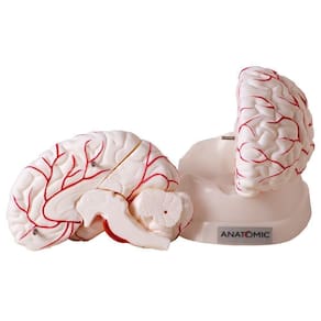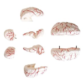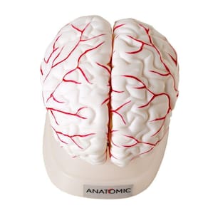 Modelo anatômico do cérebro desenvolvido para estudo e demonstração, evidencia sistema vascular arterial na região anterior, média e posterior, giros e sulcos cerebrais. Desmontável em até 8 partes, montado sobre base. Confeccionado em resina plástica emborrachada.