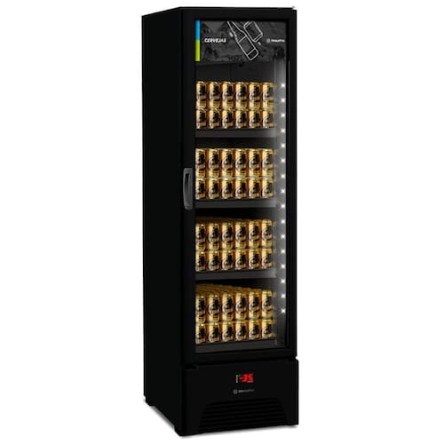 Cervejeira All Black Vn28rh Metalfrio Expositor All Black 337 Litros 220v Cervejeira Expositora Slim Optima All Black VN28 337 Litros Metalfrio. Ideal para lanchonetes, supermercados, padarias e similares. Sistema de Degelo: Frost Free: degelo automático. Controle de Temperatura: Controlador eletrônico. Faixas de Temperatura: Cervejeira 1C / -3,5C. Prateleiras: 3 prateleiras reguláveis + 1 prateleira de fundo. Fluxo de ar contínuo para resfriamento rápido e uniforme de garrafas e latas. Controlador Multitemperatura: Controlador manual e interativo com 3 faixas* de temperatura. Com controlador manual, evaporador aletado, gás ecológico, iluminação em LED, porta com vidro antiembaçante. *Duas faixas de temperaturas e função ECO. CAPACIDADE: 337 Litros. TEMPERATURA: Cervejeira 1C/-3,5C. PORTAS: 1. POTÊNCIA: 215W. ARMAZENAMENTO: 441 Latas 269ml, 324 Latas 350ml, 216 Latas 473ml, 168 Garrafas 355ml, 100 Garrafas 600ml e 60 Garrafas 1l. PRATELEIRAS: 3 prateleiras reguláveis + 1 prateleira de fundo. PESO: 70Kg. DIMENSÕES EXTERNAS (CxAxL): 52,5x189,2x62,2cm. Com os Selos de Qualidade ISO 9001 e de Gestão Ambiental ISO 14001. Cervejeira Expositora Slim Optima All Black VN28 337 Litros Metalfrio é na Atau. Apresentação do Produto - Marca - Metalfrio Modelo - VN28AH All Black Capacidade - 337 Litros Frente - 52,5cm Altura - 189,2cm Profundidade - 62,2cm Temperatura - Cervejeira 1C / -3,5C Peso - 78Kg Portas - 1 Porta Prateleiras - 3