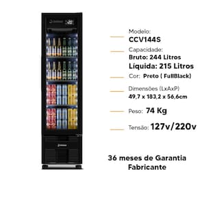 Especificações Técnicas: -Marca: Imbera -Modelo: CCV144 Full Black -Tipo de Freezer: Cervejeira Vertical -EAN: 798190254449 -Cor: Preto -Capacidade: 244 Litros -Capacidade Líquida: 215 Litros -Capacidade Garrafa 600ml: 97 -Capacidade Long Neck 355ml: 156 -Capacidade Lata 350ml: 240 -Porta de vidro: Sim, Vidro duplo -Exposição e Conservação de cerveja: Sim -Controlador Multitemperatura: 4 faixas de temperatura ajustáveis -Faixa de Temperatura: -6ºC até +2ºC -Prateleiras ajustáveis: Sim -Prateleira: 3+0 -Trava de Autofechamento: Sim -Iluminação: LED perimetral -Tipo de refrigeração: Dinâmica -Evaporador: Aletado -Degelo: Automático -Gás: R290 -Espuma isolante: ecológica e eficiente, livre de CFC e HFC. -Dimensões Internas (L x A x C): 40 x 130 x 42,4 cm -Dimensões Produto (L x A x C): 48,2 x 183,2 x 53,7 cm -Tensão: Bivolt -Peso: 74 kg -Peso Bruto: 77 kg