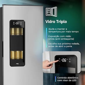 Vidro triplo UV e LED interno destacam as bebidas.