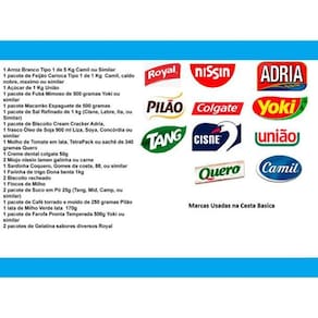 Cesta Basica Premium Completa Produtos De Marca 24 Itens Cesta Básica Completa Produtos de Primeira Qualidade 24 Itens Fotos Reais Produtos de qualidade. Cesta montada para quem quer adquirir/doar produtos de alta qualidade, as fotos dos produtos da cesta básica são reais. De 14-16 KG Todos os itens com validade longa, adquirido direto dos fabricantes e/ou distribuidores oficiais. 1 Arroz Branco Tipo 1 de 5 Kg Camil 1 pacote de Feijão Carioca Tipo 1 de 1 Kg Camil 1 Açúcar de 1 Kg União 1 pacote de Fubá Mimoso de 500 gramas Yoki, hikari ou 1 pacote Macarrão Espaguete de 500 gramas adria ou 1 pacote de Sal Refinado de 1 kg Cisne, Lebre, Ita, ou 1 pacote de Biscoito Cream Cracker Adria, 1 frasco Óleo de Soja 900 ml Liza, Soya, Concórdia ou 1 Molho de Tomate em lata, TetraPack ou sachê de 340 gramas Quero 1 Creme dental colgate/ OralB 90g 2 Miojo nissin lamen galinha ou carne 1 Sardinha Coquero, Gomes da costa, 88, ou 1 Farinha de trigo Dona benta ou sol 1kg 2 Biscoito recheado 1 Flocos de Milho bonomilho ou 2 pacote de Suco em Pó 25g Tang, Mid, Camp, ou 1 pacote de Café torrado e moído de 250 gramas Pilão 1 lata de Milho Verde lata 170g 1 pacote de Farofa Pronta Temperada 500g Yoki, kisabor ou 2 pacotes de Gelatina sabores diversos Royal Obs.: Garantimos as marcas dos produtos da Cesta salvo em caso de escassez ou falta no fabricante/fornecedor, no caso substituiremos por outro de igual qualidade. Marca: Não Informado