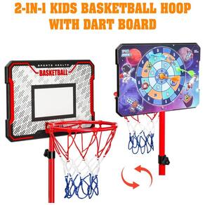 Duplique a diversão do esporte de tiro com o aro de basquete de dois lados Meland. Equipado com um painel de aço resistente e plástico rígido, o conjunto inclui 3 bolas de basquete coloridas e um aro ajustável. A parte de trás do painel é um alvo de dardos pegajoso com 6 dardos. Aproveite brinquedos esportivos competitivos e recreativos ao ar livre para crianças de 3 a 8 anos.