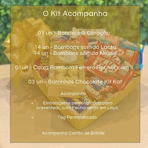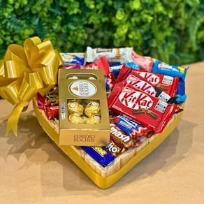 Cesta De Chocolate Formato Coração Com Lindo Laço Presente Tipo: Dourado Cesta de Chocolates em Formato de Coração - Surpreenda com Carinho e Sabor Essa linda cesta em formato de coração foi criada para transformar momentos especiais em lembranças doces e inesquecíveis. Com uma seleção das marcas de chocolates mais amadas - Lacta, Nestlé, Kit Kat e Ferrero Rocher - ela é perfeita para quem deseja presentear com afeto, elegância e praticidade. Indicada para datas como Dia das Mães, Dia dos Namorados, aniversários, noivados ou para demonstrar gratidão de forma afetiva. Tudo é preparado com cuidado, montado artesanalmente e pronto para ser entregue diretamente na casa de quem você ama, já com mensagem personalizada inclusa. Destaques do Produto: Um presente cheio de afeto: a cesta em formato de coração encanta pela aparência e pelo sabor Praticidade para quem presenteia: entrega direta com mensagem personalizada enviada por você Embalagem com laço decorativo, pensada para emocionar desde o primeiro olhar Ideal para surpreender em ocasiões românticas, familiares ou corporativas Montagem artesanal, com chocolates frescos das marcas mais queridas Conteúdo da cesta: 14 bombons Lacta 14 bombons Nestlé 3 unidades de Kit Kat 1 caixa de Ferrero Rocher Embalagem com laço decorativo Cartão com mensagem personalizada mensagem enviada após a compra Cesta de chocolate presente, cesta em formato de coração, presente dia das mães, presente dia dos namorados, presente romântico com chocolate, cesta com ferrero rocher, kit chocolate lacta nestlé, presente com mensagem personalizada, presente feminino criativo, cesta de bombom com laço, presente de aniversário, presente afetivo com entrega, cesta de chocolates , mimo doce para surpreender, presente pronto para envio