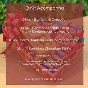 Cesta De Chocolate Formato Coração Com Lindo Laço Presente Tipo: Natal Cesta de Chocolates em Formato de Coração - Surpreenda com Carinho e Sabor Essa linda cesta em formato de coração foi criada para transformar momentos especiais em lembranças doces e inesquecíveis. Com uma seleção das marcas de chocolates mais amadas - Lacta, Nestlé, Kit Kat e Ferrero Rocher - ela é perfeita para quem deseja presentear com afeto, elegância e praticidade. Indicada para datas como Dia das Mães, Dia dos Namorados, aniversários, noivados ou para demonstrar gratidão de forma afetiva. Tudo é preparado com cuidado, montado artesanalmente e pronto para ser entregue diretamente na casa de quem você ama, já com mensagem personalizada inclusa. Destaques do Produto: Um presente cheio de afeto: a cesta em formato de coração encanta pela aparência e pelo sabor Praticidade para quem presenteia: entrega direta com mensagem personalizada enviada por você Embalagem com laço decorativo, pensada para emocionar desde o primeiro olhar Ideal para surpreender em ocasiões românticas, familiares ou corporativas Montagem artesanal, com chocolates frescos das marcas mais queridas Conteúdo da cesta: 14 bombons Lacta 14 bombons Nestlé 3 unidades de Kit Kat 1 caixa de Ferrero Rocher Embalagem com laço decorativo Cartão com mensagem personalizada mensagem enviada após a compra Cesta de chocolate presente, cesta em formato de coração, presente dia das mães, presente dia dos namorados, presente romântico com chocolate, cesta com ferrero rocher, kit chocolate lacta nestlé, presente com mensagem personalizada, presente feminino criativo, cesta de bombom com laço, presente de aniversário, presente afetivo com entrega, cesta de chocolates , mimo doce para surpreender, presente pronto para envio