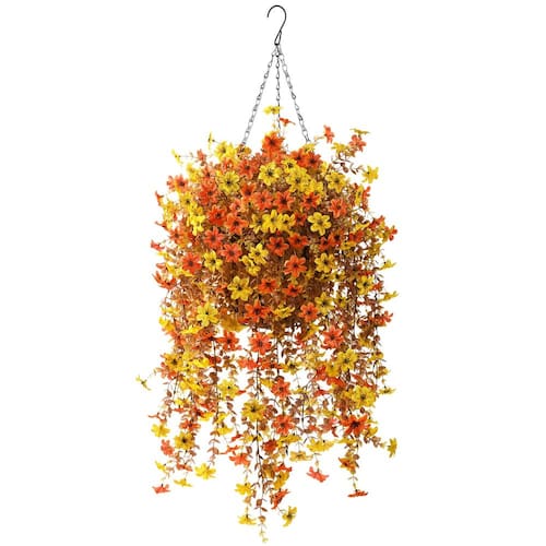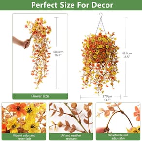 Inclui cestas suspensas de forro de coco de 25,4 cm com corrente de espuma de plantas verdes, flores de seda artificial. - Montagem simples: este é um projeto DIY que leva apenas 5 minutos para montar. Basta colocar a seda na cesta e projetar a forma. Se precisar de mais orientações, consulte as fotos ou vídeos listados acima. - Embalagem: inclui cestas suspensas de forro de coco de 25,4 cm com corrente, flores de seda artificial. As flores falsas estão sempre em plena floração, parecem reais e modernas, dando a você uma sensação fresca e elegante. - Especificações: o tamanho após a montagem é de aproximadamente 35 cm × 35 cm × 63 cm (C × L × A); a cesta mede 25,4 cm × 25,4 cm × 17 cm (C × L × A) e o comprimento da corrente é de 35 cm. - Material: a imagem suspensa é feita de material de qualidade de seda e não requer manutenção após a montagem. Não é necessário regar, pode ser ajustado livremente. Resiste aos raios UV, não desbota e é forte o suficiente em qualquer clima. - Uso: a orquídea artificial é adequada para decoração de parede interna, quarto de festa e casamento, aniversário, dia dos namorados, banheiro, decoração de casa. As videiras artificiais com flores podem ser penduradas em salas de estar, corredores, varandas, cafés, restaurantes e corredores, jardins ao ar livre decoram a casa. Ela floresce durante todo o ano, adicionando uma sensação de primavera ao seu visual.