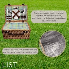 Leve a diversão e o conforto do piquenique para onde você for com esta cesta completa e elegante Perfeita para quem ama momentos ao ar livre, ela oferece tudo que você precisa para uma refeição prática e agradável, com a garantia de qualidade e durabilidade.