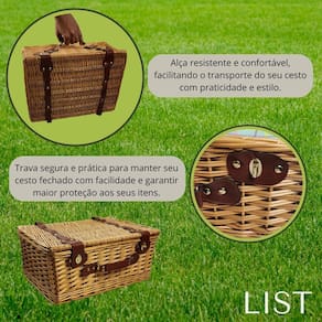 Benefícios: - Design Compacto e Prático: A cesta é ideal para transporte e armazenamento, ocupando pouco espaço, mas comportando tudo o que você precisa para um piquenique. - Material Durável e Resistente: Itens de alta qualidade, como os pratos de melamina e os talheres de aço inox, garantem longa durabilidade. - Versátil: Perfeita para piqueniques, festas ao ar livre, passeios no campo ou até mesmo para um lanche improvisado no jardim de casa.