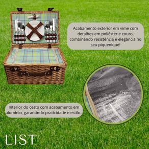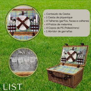 Características do Produto: - Conteúdo da Cesta: - 1 Cesta de piquenique - 4 Pratos de melamina - 4 Copos de PS Poliestireno - 4 Talheres garfos, facas e colheres em aço inoxidável e polipropileno - 1 Abridor de garrafas