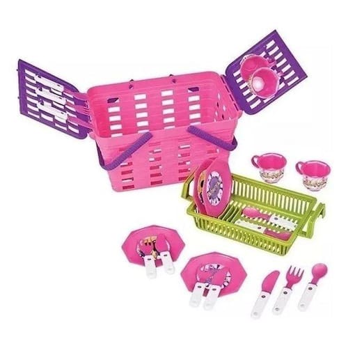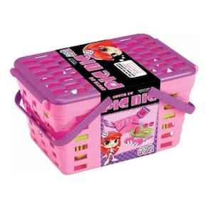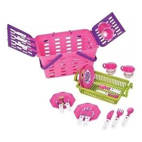 Cesta De Pic Nic Infantil Menina Rosa 18 Peças Brinquedo
