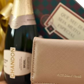 Cesta Presente Chandon Baby + Chocolate + Carteira Feminina Cesta Chandon Baby com Chocolate e Carteira Feminina - presente completo e elegante Surpreenda com um presente pronto para entregar. A cesta Decorally Home Decor combina Chandon Baby 187 ml, chocolate premium e uma carteira feminina cores , tudo em uma cesta com alça e acabamento dourado. Vai embalada para presente com celofane, laço caprichado e tag para mensagem - perfeita para aniversários, fim de ano, clientes, colaboradoras e amigos-secretos. Conteúdo da Cesta 1 Chandon Baby 187 ml 1 Chocolate marca pode variar: seleção premium 1 Carteira Feminina cores : preto, marrom, nude, off-white ou ouro velho 1 Cesta com alça aprox. 20 13 cm Embalagem para presente com laço + tag para recado As cores da carteira podem ser escolhidas Sim. Envie uma mensagem após a compra indicando a cor desejada. O envio é sujeito à disponibilidade. O chocolate e a embalagem são iguais às fotos Mantemos o padrão de qualidade, mas marcas/estampas podem variar conforme disponibilidade. Vai pronto para presentear Sim. Acompanha celofane, laço e tag. Enviamos dentro de caixa para proteção. Qual o tamanho da cesta Aproximadamente 20 13 cm medida da base, pode variar levemente . Existe cartão personalizado Incluímos tag para mensagem. Cartão maior pode ser adicionado mediante consulta. Há restrição de venda Sim. Bebida alcoólica: venda proibida para menores de 18 anos. Consumo responsável.
