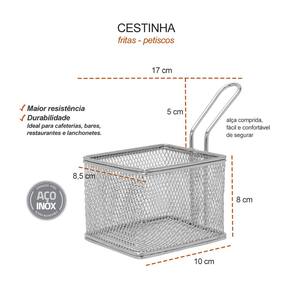 Cesta para batatas fritas e frangos e copinho para molho. A cestinha é perfeita para restaurantes, bares, lanchonetes e buffet. Produzida em aço inox, resistente e duravel, suporta altas temperaturas e possui alça longa para manusear com segurança.