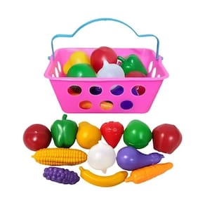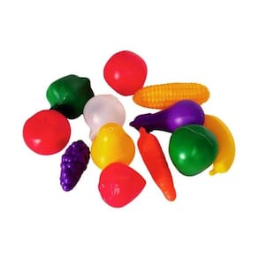 O conjunto inclui uma variedade de frutas e legumes em miniatura, como maçã, banana, cenoura, milho, entre outros, todos confeccionados em plástico colorido e resistente, com acabamento arredondado e seguro para o manuseio infantil.