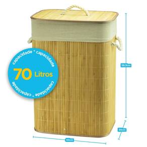 - Capacidade 70 Litros - Acompanha saco de tecido interno. - Dimensões 40 x 58,5 x 30cm largura x altura x profundidade - Material Durável: Feito de bambu, resistente e ecológico. - Tampa Protetora: Mantém odores e sujeira fora de vista. - Alças Confortáveis: Facilita o transporte de roupas. - Design Elegante: Combina com qualquer decoração.